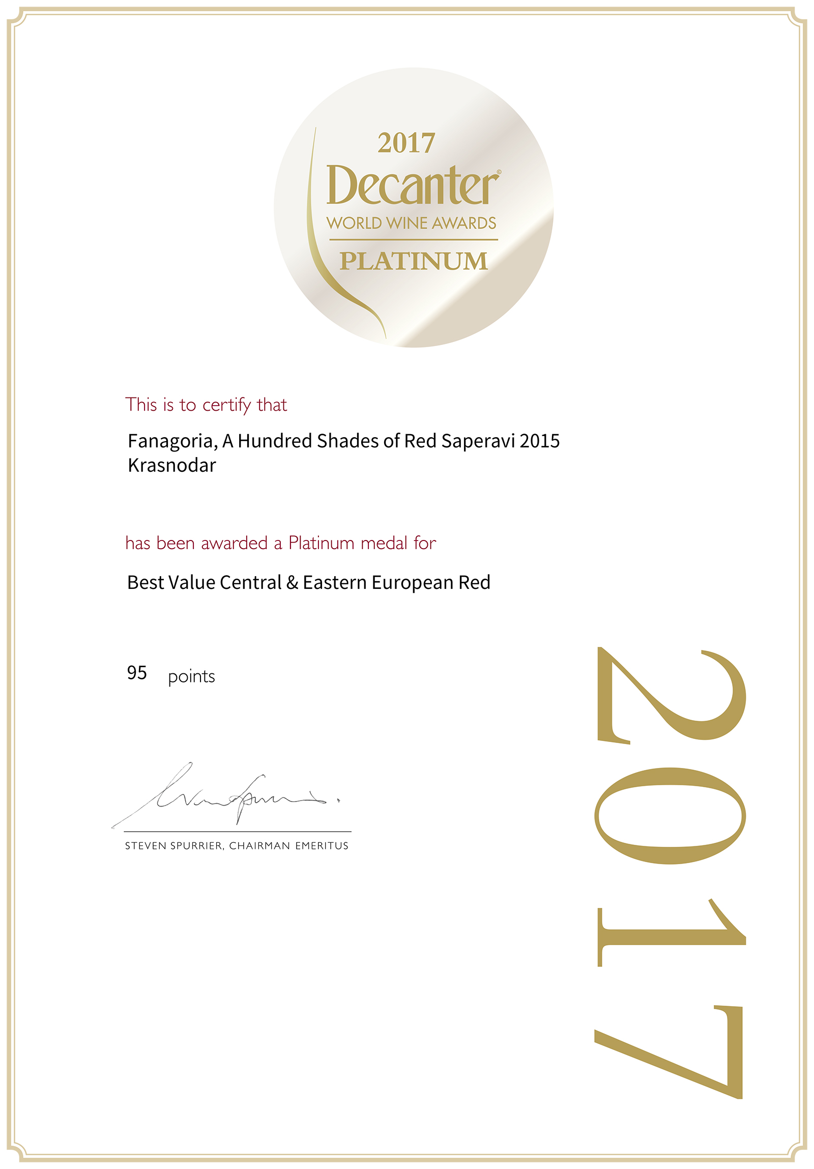 Фанагорийское «Саперави» урожая 2015 года из коллекции «100 оттенков красного» впервые в истории стало обладателем платиновой медали престижного международного конкурса Decanter в Лондоне, получив 95 баллов по 100-балльной системе.