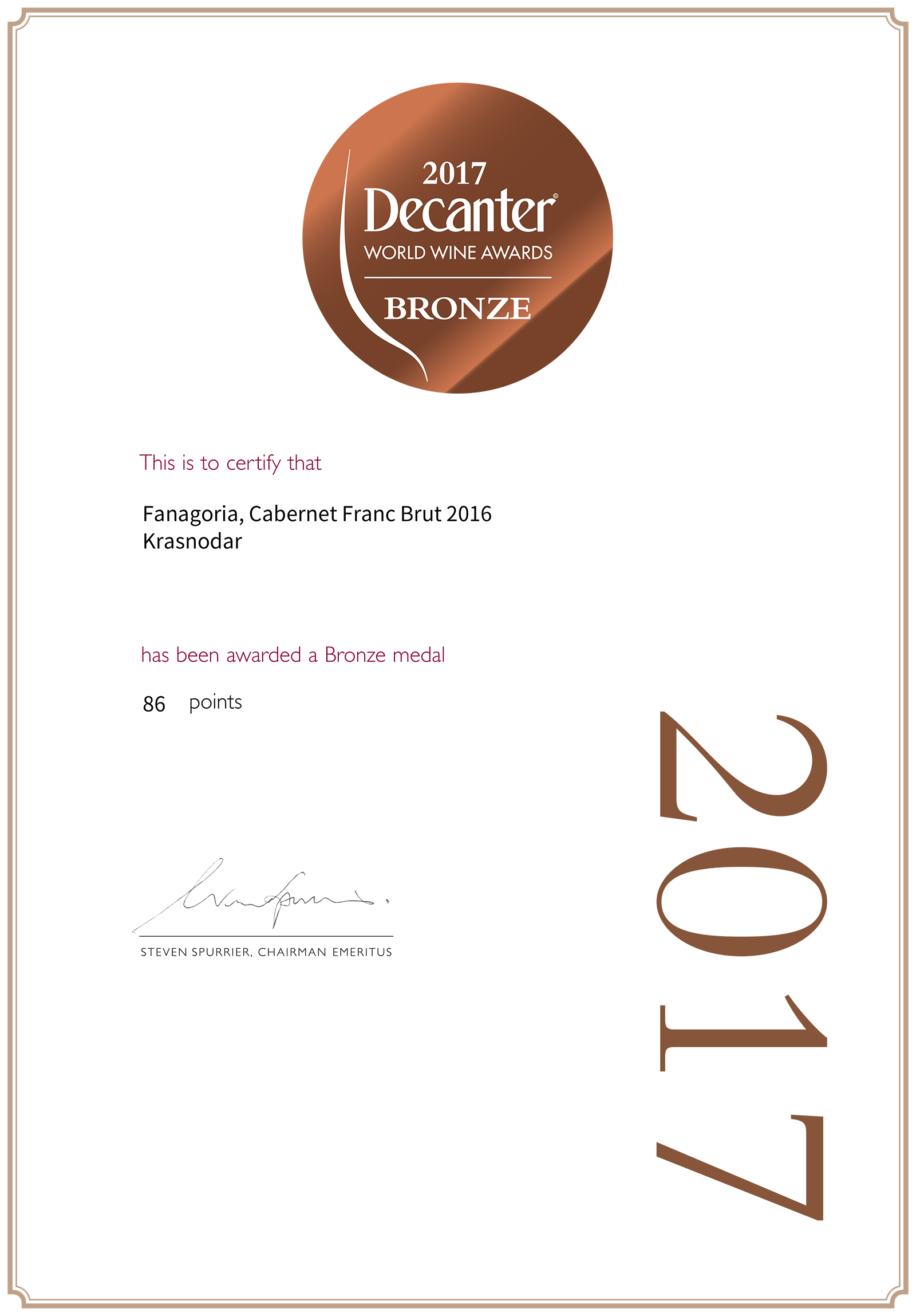 - «Каберне-Фран брют 2016» молодое игристое – бронзовая медаль (86 баллов);
