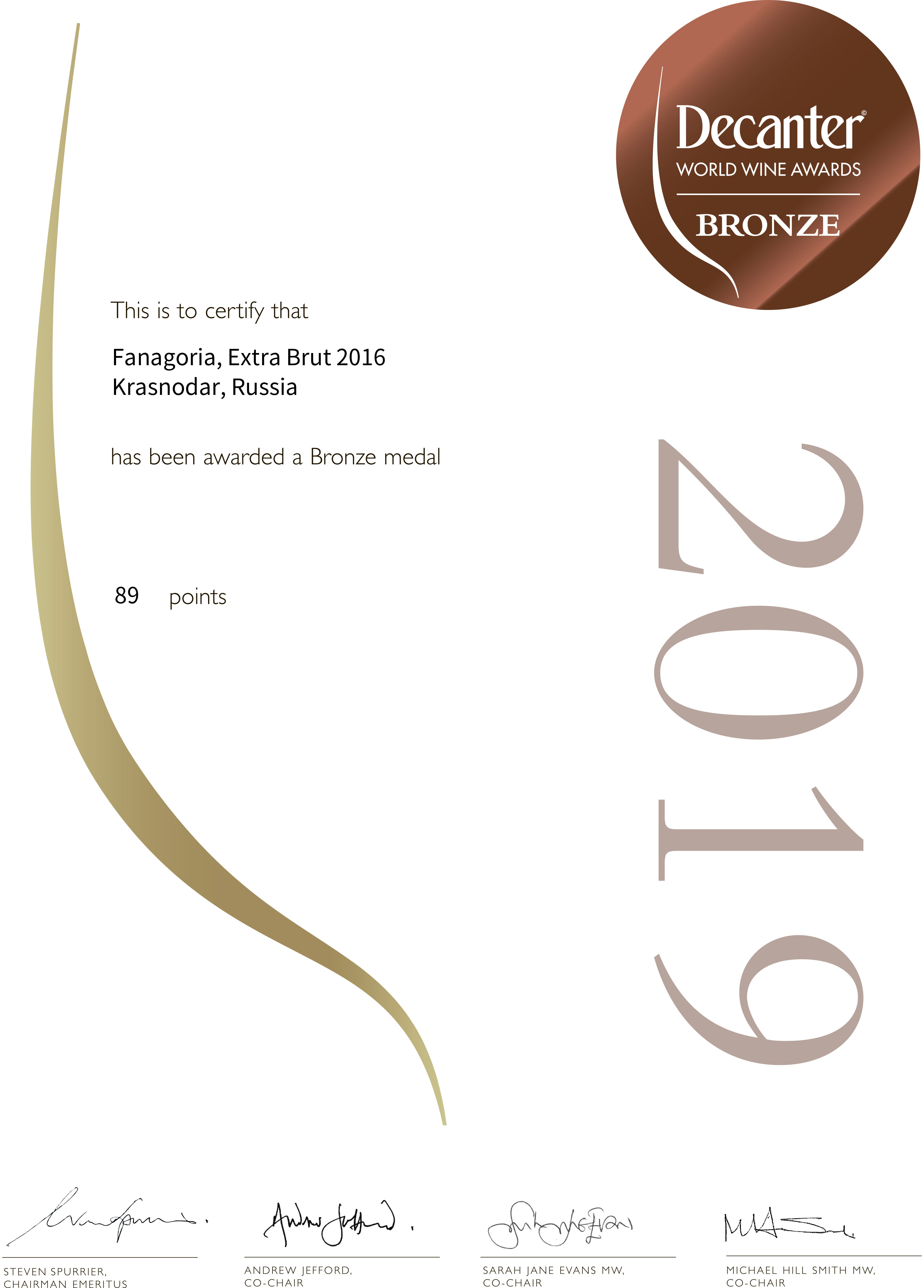 Новинка 2019 года – игристое вино «Фанагория экстра-брют 2016» выдержанное белое ЗНМП «Сенной» - получило бронзовую медаль c оценкой 89 баллов на престижном международном дегустационном конкурсе в Лондоне Decanter World Wine Awards 2019.
