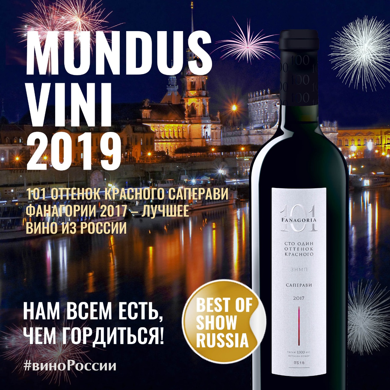 - Выдержанное вино «101 оттенок красного Саперави Фанагории 2017» - золотая медаль и номинация «Best of Show Russia»/«Лучшее вино из России».
